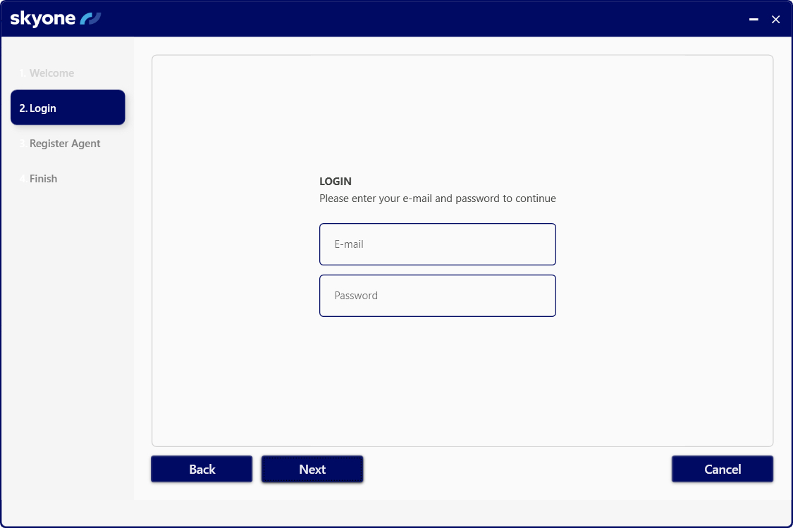 Enter your Skyone Studio access credentials and click "Next".