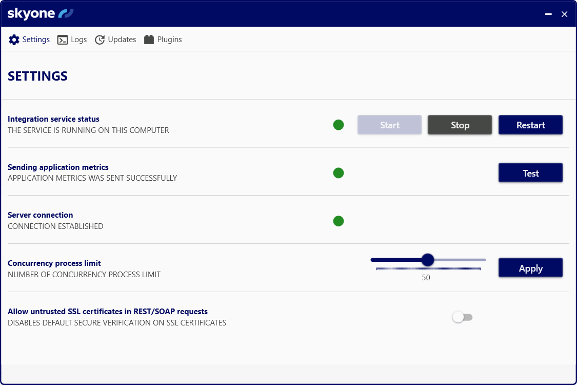 Integration service status: it is possible to Start, Stop, and Restart the integration service. When the service is stopped, operations in Skyone Studio involving accounts connected to a registered Terminal cannot be executed.