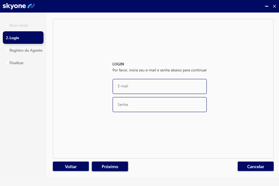 Informe suas credenciais de acesso ao Skyone Studio e clique em "Próximo".
