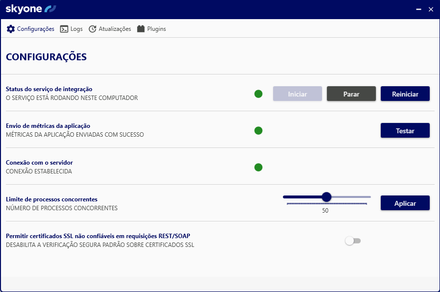 Status do serviço de integração: é possível Iniciar, Parar e Reiniciar o serviço de integração. Quando ele é parado, não é possível executar operações no Skyone Studio. envolvendo contas conectadas com "Terminal" cadastrado.