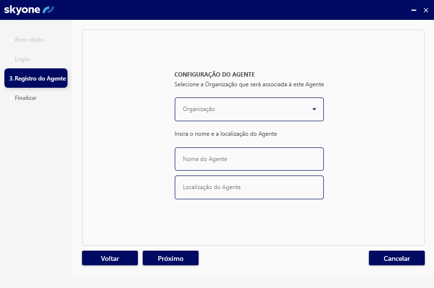 Selecione a organização (espaço de trabalho) que deseja utilizar o "Agente", bem como digite um nome e localização para o mesmo.